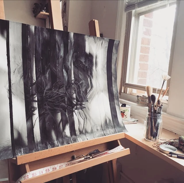 My process is meditative. I gravitate towards all different kinds of materials and am constantly collecting pieces of inspiration, from photography, papers and fabrics to insects and plant life. I begin creating by observing these pieces of inspiration and meditating on their arrangement. Slowly a narrative begins to reveal itself. In a back-and-forth process of mark making, collaging, and layering this narrative, which began as a scattered observation, develops into its own moment. The careful repetitive nature of deconstructing and reconstructing my materials by hand allows me to enter a very tranquil and introspective space throughout the creative process and always leaves me feeling intimately attached to the artwork I create. As my hand works through this intensive layering process I am thinking about my own relationship with the narrative I am creating but also about the endless potential that I hope to provoke in viewers as they find their own path through the finished pieces. I work in a wide range of artistic mediums including oil, gouache, ink, found object, embroidery, collage, fiber and print making.